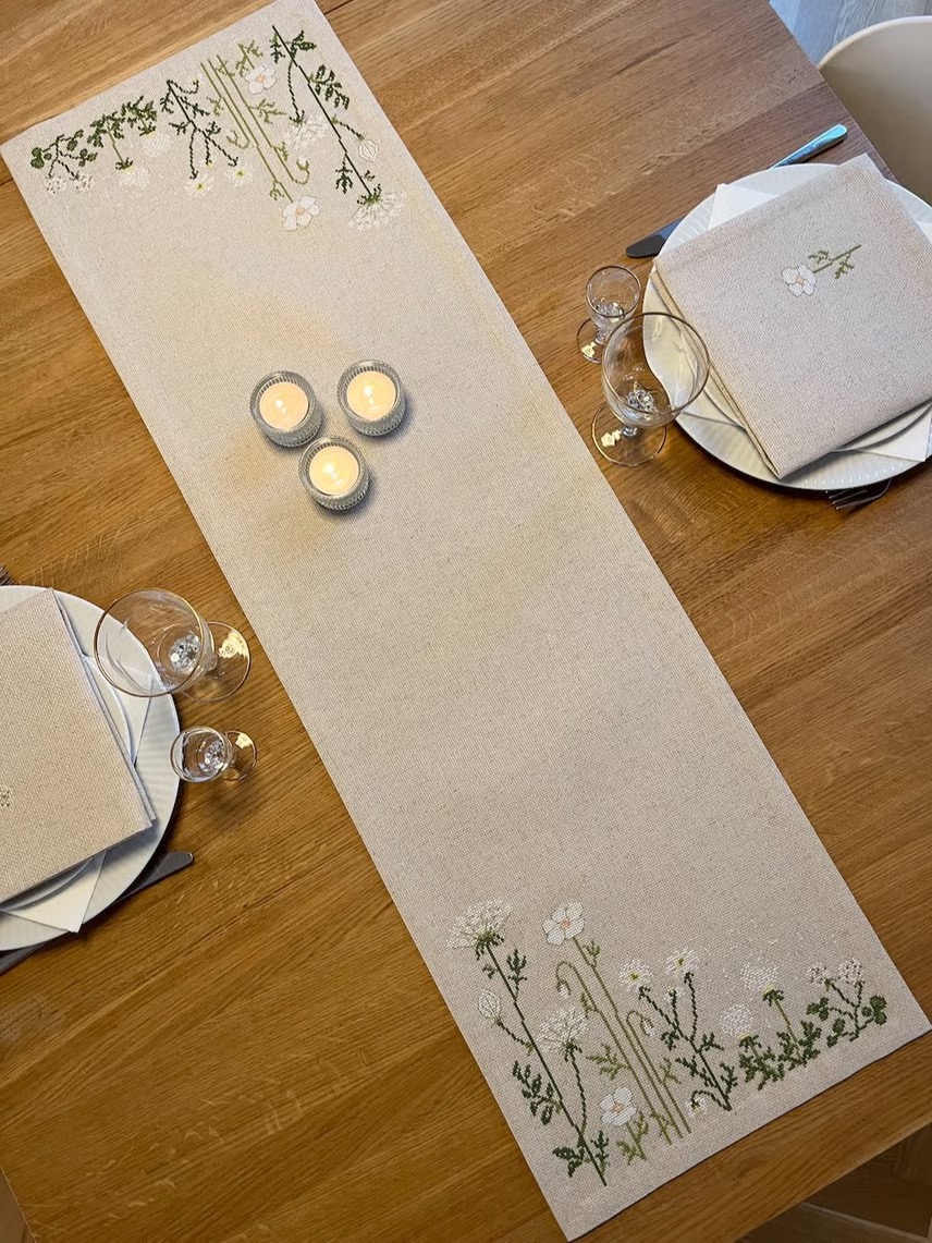 Mål: 30 x100 cm Broderikittet indeholder: Rustik Aida 80% bomuld og 20% hør 5,4 sting pr. cm. DMC mouline garn art 117, nål, mønster med farver og symboler og vejledning.