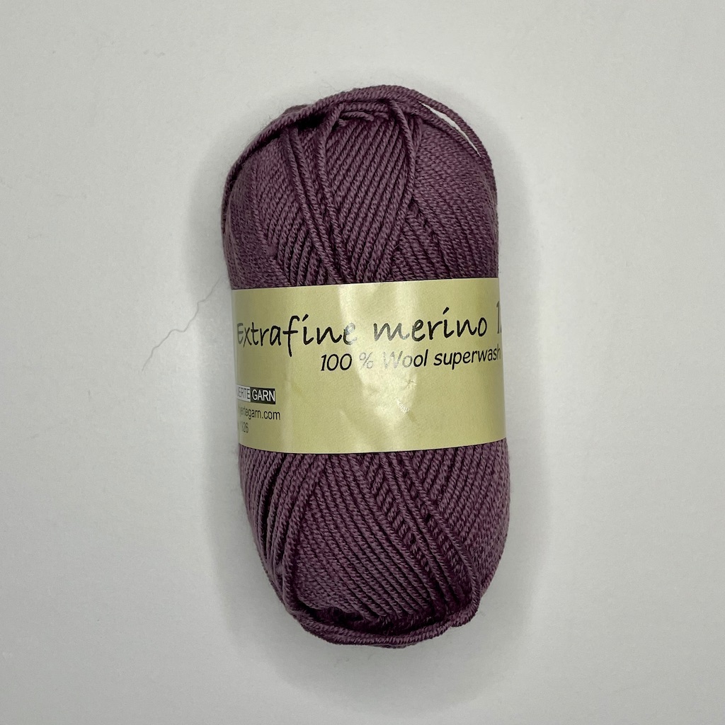 100% Wool superwash Vægt: 50 g løbelængde. ca. 120m Strikkefasthed: 22m Pinde: 3½-4 Vask: 30° uldprogram