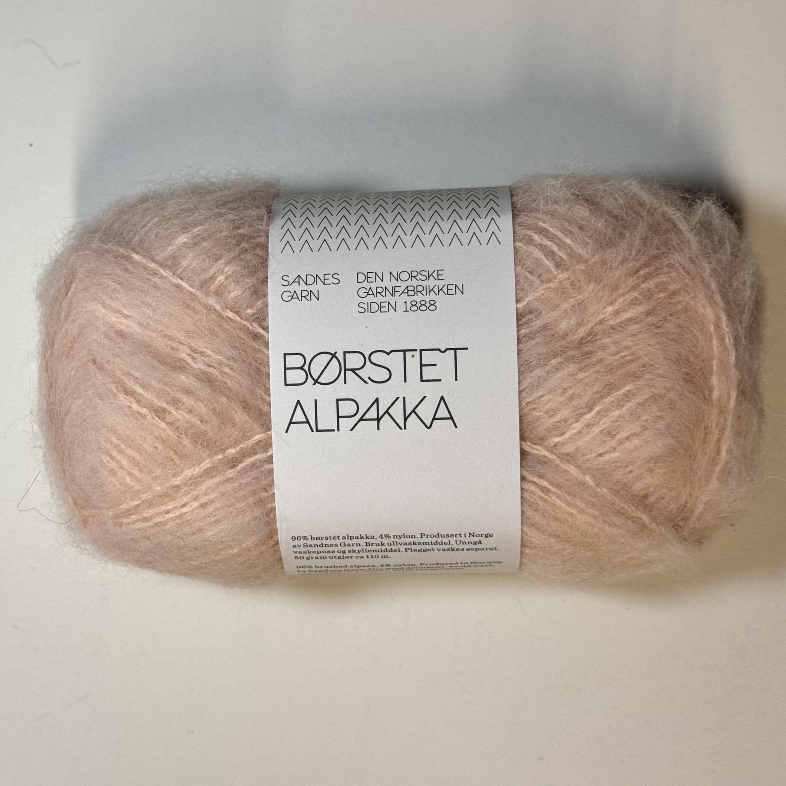 Løbelængde: Ca. 110 meter pr. 50 gram Vejledende pinde: Pinde nr. 4-7 Strikkefasthed: 18-12 masker = 10 cm Råmaterialet kommer fra: Peru Børste Alpakka er skøn, blød garn som består af 96% børstet alpaka, 4% nylon