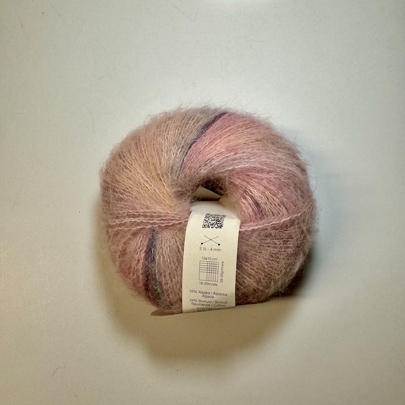 Nellie består af 55% superfine, børstet alpaka, 24% bomuld og 21% merinould